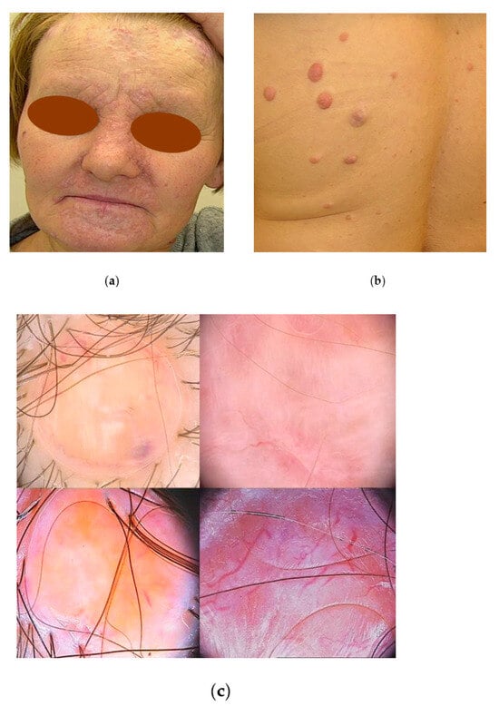 A 59-year-old female patient was referred for non-invasive examination and treatment of multiple skin-coloured tumours present in the head and trunk area (Figure 7a,b). The videodermoscopy enabled us to reveal of different aspects of cylindromas and helped rule out the presence of basal cell carcinomas (Figure 7c). With the aim of obtaining the final diagnosis and identifying the symptoms of neurofibromas, surgical excisions and electrodissections of lesions were performed. The histopathology confirmed the diagnosis of cylindromas. As numerous relatives of the patient presented similar symptoms, the genetic confirmation of the Brooke–Spiegler syndrome was also performed. Unfortunately, the removal of solitary cylindromas is not radical, and frequently results in recurrences, though in the case of large lesions localised on the scalp, the treatment brings the patient relief of troublesome and seldom ulcerated tumours. Both the patient and her family were taken under close surveillance by a dermatologist, laryngologist, and gastroenterologist to achieve early diagnosis and treatment of potential malignancies.