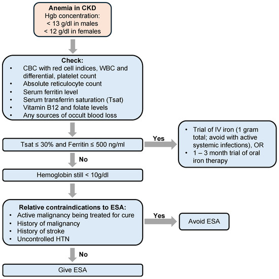 When people with CKD are found to have anemia, guidelines recommend testing for specific causes of the anemia, which include iron, vitamin B12, and folate deficiency, as well as sources of occult blood loss [63] (Figure 3). If iron deficiency is identified (transferrin saturation level ≤30% and a ferritin level ≤500 ng/mL), iron repletion is recommended and can sometimes require the use of IV iron infusions [64]. Erythropoiesis-stimulating agents can be initiated when iron stores are replete but hemoglobin is still <10 g/dL. The use of ESAs is relatively contraindicated for people with an active malignancy being treated with a curative intent, a history of malignancy, a history of stroke, or uncontrolled HTN [65]. The risks and benefits of using oral hypoxia-inducible factor-prolyl hydroxylase enzyme inhibitors (HIF-PHI) for people with non-dialysis-dependent CKD are being actively investigated [66,67].