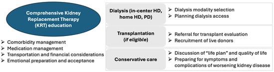 People with advanced CKD face complex medical decision-making and benefit from early education surrounding KRT modalities. Education programs can enable people with CKD to better understand kidney failure, overcome fears about dialysis, and maintain a feeling of control. People with CKD and their care teams can weigh the available treatments options and avoid emergent “crash” dialysis starts. KRT education can also allow people with CKD to process their diagnoses and share information with family members or care partners. Pre-dialysis education has been shown to reduce the incidence of urgent dialysis starts, lower mortality, and even extend the time to dialysis initiation by a median of 6 months [104,105,106,107,108,109,110]. People with CKD who receive pre-dialysis education are also more likely to choose home dialysis modalities and to receive a pre-emptive kidney transplant (prior to the initiation of dialysis) [108,111,112,113]. KRT education encompasses various components relevant to each KRT modality (Figure 4).