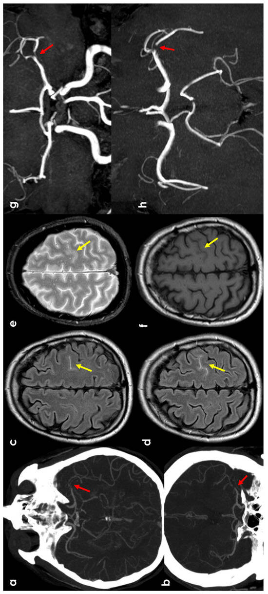 Figure 2. cSAH in a patient with left distal M1 MCA acute steno-occlusion. Panels (a,b) show CT angiography reconstructed with the maximum intensity projection/MPR tool in the axial and coronal planes, respectively, showing the focal lack of left MCA opacification corresponding to vessel occlusion (red arrows). Panels (c,d) show axial FLAIR-MRI slices with spontaneous hyperintensity in the precentral sulcus (yellow arrows), suggestive of cSAH. The same sulcus is relatively hyperintense in T2* (panel (e)) and not clearly discernible in the T1 sequence (panel (f)). Panels (g,h) illustrate MR angiography on the axial and coronal plane, reconstructed with the MIP/MPR tool (the red arrows focus on the occlusion).