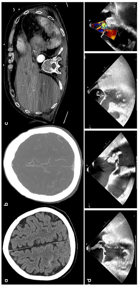 Figure 3. cSAH in a patient with infective endocarditis. Panel (a) shows NCCT with a linear hyperdense content in the right central sulcus. Panel (b) shows the corresponding axial reconstructed CT angiography with normal finding. Panel (c) underlines multiple splenic infarctions. Panel (d) shows multiple views of transesophageal echocardiography with a huge vegetation on the posterior leaf in the mitral valve.