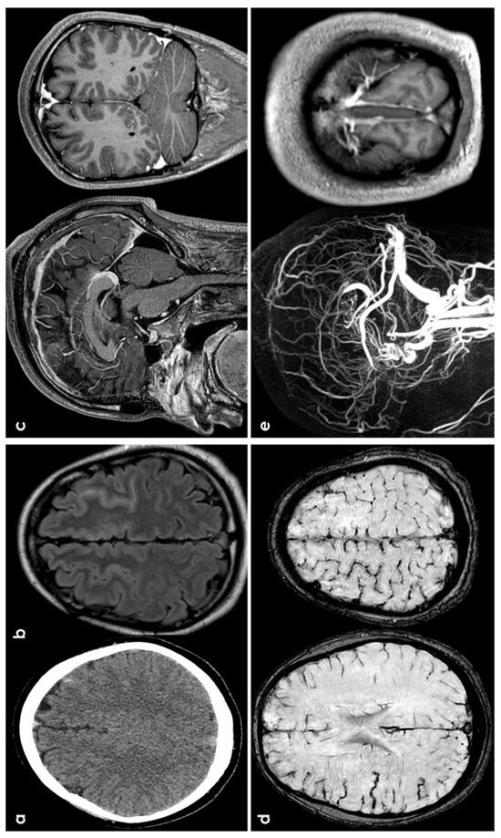Figure 4. cSAH in a patient with CVT. Panels (a,b) show, respectively, NCCT and FLAIR MRI with, respectively, hyperdense and hyperintense left superior frontal sulcus, suggestive of SAH. Panel (c) shows sagittal and coronal view of post GBCA with an extensive superior sagittal sinus thrombosis. Panel (d) highlights in SWI the cortical venous congestion in the right hemisphere. Panel (e) focuses on MR angiography reconstructed in sagittal plane, confirming the SSS thrombosis and the lack of intravascular contrast in the posterior third of the SSS on T1-MRI.