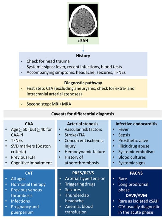 Currently, attention towards CAA is considerable and probably increasing, as is attention towards cSAH as a manifestation of CAA. However, this is not the only cause, and it is sometimes appropriate to remember that in individual patients, some other causes likely deserve consideration, if only to be excluded. This is because patients enrolled in the derivation and validation cohorts of the Boston criteria 2.0 [12] are highly selected by centers with a marked focus on the disease and its differential diagnosis. Therefore, the extensive application of the criteria requires a preliminary stage of differential diagnosis. Additionally, lowering the age threshold in the Boston criteria 2.0 [12] to 50 years makes the topic of the differential diagnosis of cSAH with other diseases even more delicate, especially in patients without a previous vascular history. The aim of this review is, therefore, to draw attention to the etiological differential diagnosis of cSAH beyond CAA.