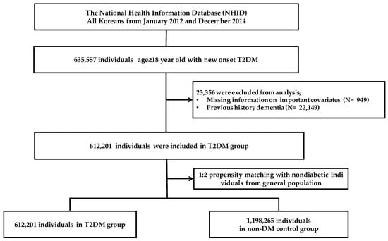 Among this database, a total of 1,235,416 participants (391,110 individuals from the T2DM group and 844,306 individuals from the control group) completed health checkups provided by the NHIS between 1 January 2012 and 31 December 2014 and were included in the subgroup analysis. The association between T2DM, dementia outcomes by age at the diagnosis of T2DM and glycemic control was examined after adjusting for multiple clinical factors.