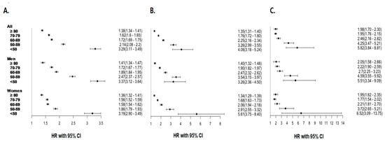 Adjusted hazard ratios (95% confidence interval [CI]) for all dementia (A), Alzheimer’s disease (B), and vascular dementia (C) in patients with type 2 diabetes mellitus according to the age at diagnosis of type 2 diabetes, in comparison with matched controls. The analyses were adjusted for severe hypoglycemia.