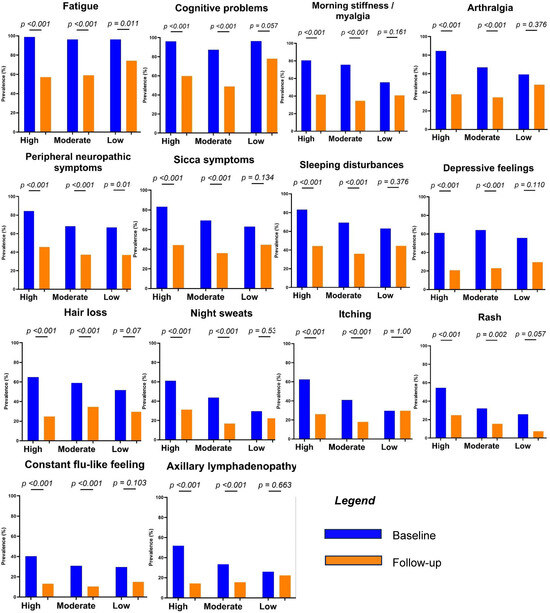 Figure 1 (associated data can be found in Supplementary Table S1) presents the post-explantation symptom improvement per symptom, stratified by BII probability. The most substantial symptom improvement was observed among women with a high suspicion of BII, although noteworthy improvements were also observed in the group of women with moderate suspicion of BII. Conversely, women with a low suspicion of BII who still opted for implant removal displayed significant improvement only in fatigue and peripheral neuropathic symptoms (p = 0.011 and p = 0.018, respectively).
