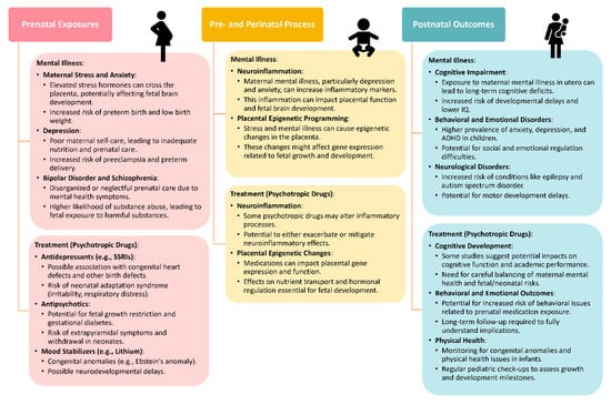 Adverse outcomes caused by mental illness or its treatment across different stages. These include prenatal exposure [106], pre- and perinatal process [107], postnatal outcomes [108].