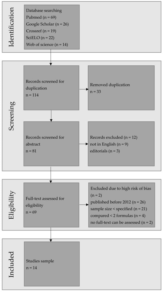 After duplicates had been eliminated, 81 articles were retrieved and subjected to analysis. Following an initial search, 14 papers were selected for further scrutiny. The detailed PRISMA flow chart (Figure 1) illustrates the process of identification, screening, and final selection of papers for this review. It was observed that various formulas exhibit specific advantages and disadvantages in terms of patient age. Several tools can be employed to evaluate the accuracy of the selected formula. Most studies typically assess mean absolute error (MAE) and the percentage of eyes within ±0.5 D, while median absolute error (MedAE) is less commonly used. Hoffer et al. recommended MedAE as a primary outcome due to the non-normal distribution of absolute refractive prediction errors [24]. Cooke et al. suggested a mean rank score for subgroup analysis, such as one based on axial length (AL) [25], while Haigis introduced his own ranking system [24]. More recently, studies have increasingly relied on root mean square absolute error (RMSAE) as an outcome [26,27,28]. RMSAE values are compared between formulas using the bootstrap-t method with Holm sequential correction [27].