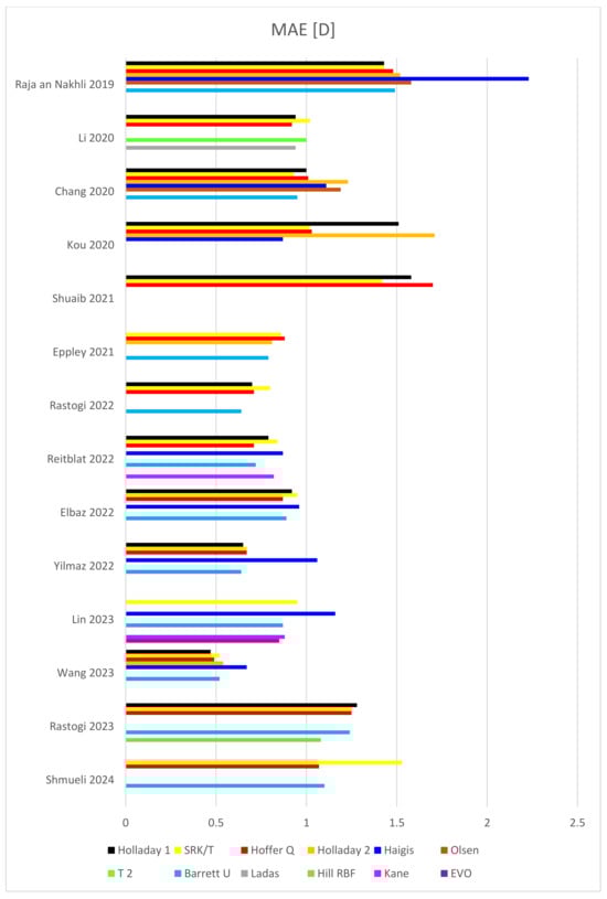 In terms of MAE, in 14 studies, Hoffer Q yielded the best outcome four times (total 693 eyes) [8,17,18,21], while SRK/T performed best three times (total 420 eyes) [19,42,44], as did Barrett Universal II (194 eyes). Barrett Universal II yielded the second-best result as many as six times (total 556 eyes) [8,17,19,20,21,48], but Holladay 1 did so in only four studies, although these studies included as many as 815 eyes) [18,44,46,47]. On the other hand, Haigis obtained the worst MAE (total 453 eyes) in 6 studies [7,17,20,42,47,48], and SRK/T did so in four, which, however, included as many as 698 eyes [8,18,46,48].