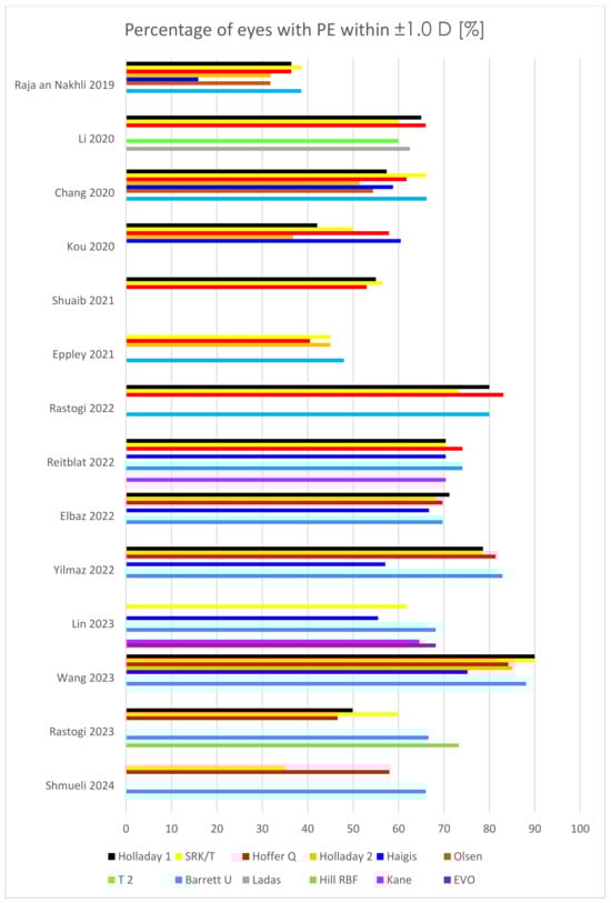 Outcomes of percentage of eyes with prediction error (PE) within ±1.0 D in children’s eyes in several recent studies [7,8,17,18,19,20,21,42,43,44,45,46,47,48].