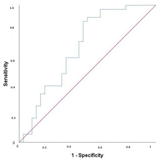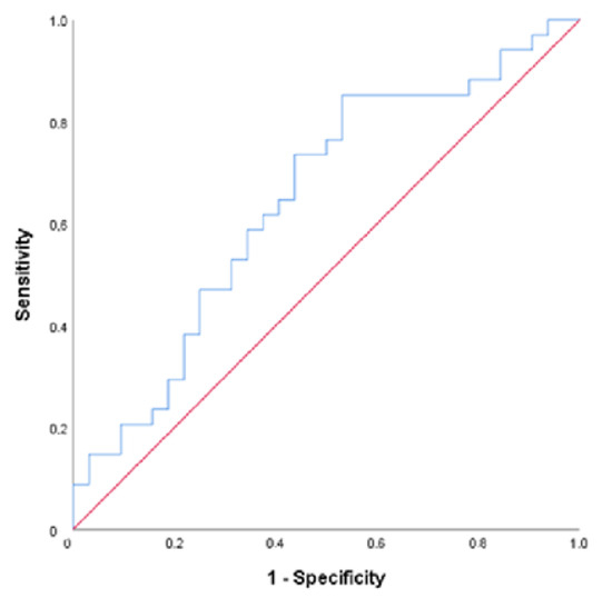 The statistical significance of our findings provides reassurance about the validity of the research. A cut-off point of ≥0.745 pg/mL for FGF21 was found to predict anemia (AUC = 0.690; p = 0.008) with a sensitivity of 88.24% and specificity of 53.12%. The PPV was 66.67%, and the NPV was 80.95% of this value for the prediction of anemia (Figure 1). We could find no cut-off point for GDF15 (AUC = 0.494; p = 0.928). A cut-off value of ≥1.265 (µg/mL) was statistically significant for NOS with a sensitivity of 73.53%, specificity of 56.25, PPV of 64.1%, and NPV of 66.67% (AUC = 0.647; p = 0.040) (Figure 2).