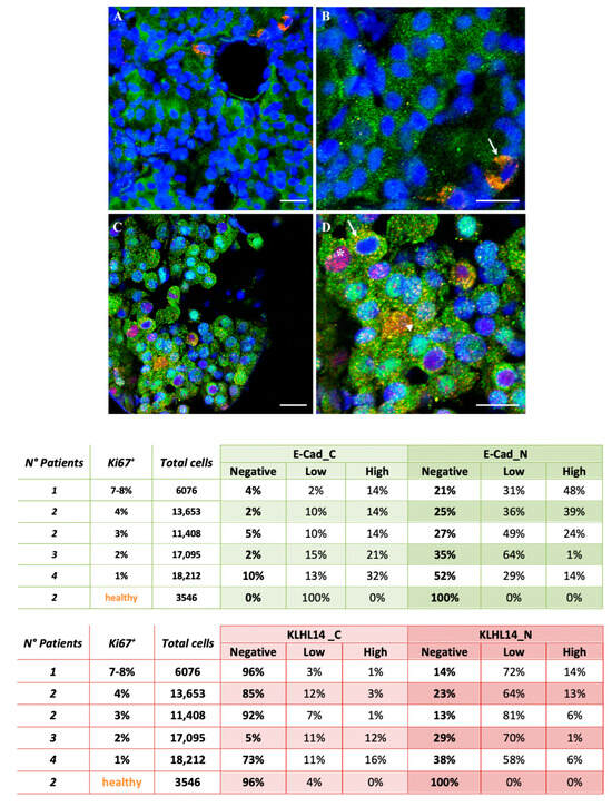 Firstly, single IHCs were performed to verify the specificity of the antibodies. In brief, heat-induced epitope retrieval was conducted for 10 min at 95 °C. Non-specific binding was blocked, incubating the sections at room temperature (RT) in 1% bovine serum albumin (BSA) in PBS for 1 h. Tissue sections were incubated overnight (O/N) at RT with 1:50 Anti-KLH14 (PA5-107155; Invitrogen, Waltham, MA, USA) and 1:200 Anti-E-Cad (CDH1) (ABIN1440031; Antibodies-online), recognizing its cytoplasmic domain [26]. Subsequently, sections were exposed respectively to 1:200 Anti-Rabbit IgG antibody—CY3 (Merck Millipore, Burlington, MA, USA; AP132C) and 1:200 Anti-Rabbit IgG antibody—Alexa Fluor® 488 (Abcam, Cambridge, UK; ab150077) for 40 min at RT. To verify E-Cad and KLHL14 co-localization, a double-labeling was carried out according to Russo et al. (2015) [27]. In brief, non-specific binding was blocked, incubating the sections as specified before. Sections were then incubated with the rabbit anti-E-Cad at RT-O/N. After washing, this immunocomplex layer was detected by an anti-rabbit Ab Alexafuor488 conjugated. Furthermore, after washing in PBS/1%BSA, the same sections were firstly fixed for 10 min with 4% paraformaldehyde/PBS, and then, after washing with PBS, incubated with a rabbit anti-KLHL14 at RT-O/N. After washing in PBS, tissue sections were then processed with a Cy3-labeled secondary goat anti-rabbit Ab. At the end of each immunoreaction, DNA was counterstained with DAPI (Sigma, St. Louis, MO, USA) diluted 1:100 in PBS for 10 min. In all experiments, non-immune serum was used in place of the primary antisera as a negative control. All controls performed were negative. At least 15 different sections for each sample were observed under an AIR laser confocal scanning microscope (Nikon, Düsseldorf, Germany), using a Plan Apo 40x oil objective. The used channels were: Channel 1: DAPI; λexc = 405 nm; Channel 2: FITC; λexc = 488 nm; and Channel 3: TRITC; λexc = 561 nm. Optimum exposure times were determined and held constant thereafter. The immune-stained sections were studied on reconstructed images made by projecting 1 lm Z-stacks of two or three consecutive confocal images. The laser confocal scanning microscope was equipped with NIS-Element software 4.40 (Nikon, Düsseldorf, Germany) used as a program for fluorescence analysis on unaltered digitalized images. Two different observers performed the qualitative assessment of immunostaining distribution and immune-fluorescence co-localizations. The three observers were blinded as to other information and considered the immune-fluorescence positivity based on its intensity in high and low and recorded the fluorescence localization giving priority to the nuclear one when both cell compartments (cytoplasm and nucleus) were stained.