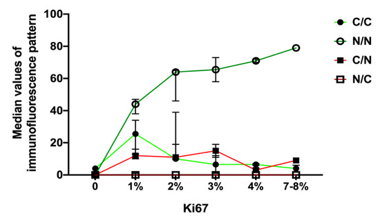 Incidence of E-Cadherin and KLHL14 immunofluorescence patterns in NF-PitNET patients with different Ki67 expression. The median values of immunofluorescence pattern are described along the y-axis inside NF-PitNET patients classified in x-axis on the basis of Ki67+ expression. The healthy patients belong to “Ki67+ = 0” category. Legend abbreviations: C/C: E-Cad_Cytoplasm/KLHL14_Cytoplasm; N/N: E-Cad_Nuclear/KLHL14_Nuclear; C/N: E-Cad_Cytoplasm/KLHL14_Nuclear; N/C: E-Cad_Nuclear/KLHL14_ Cytoplasm.