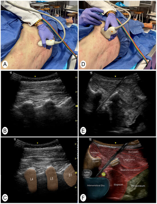 A posterior to anterior and lateral to medial approach was performed with the cadaver in lateral decubitus. To identify the target intervertebral segment, the sacrum was located manually. The transducer was then placed in a longitudinal plane of the spine to locate the facet joints (Figure 1A–C) [22]. With this image, the sacral bone and the intervertebral spaces could be clearly identified. This technique for identifying vertebral segments has been shown to be effective in the previous literature [22]. The target intervertebral space was then placed in the center of the screen and a cross-section was made with the ultrasound transducer. In this section, the spinous process, the lamina, the articular facet, and the anterior nerve root of the targeted segment were visualized [5]. The transducer was then moved slightly laterally until a clear image of the anterior root and intervertebral disc was obtained. In addition, an obliquity was generated with the lateral part of the transducer to avoid the transverse processes of the vertebrae. In the case of L5, the lateral end of the ultrasound transducer was moved slightly in a cranial direction to avoid the iliac bone. The needle was then introduced until it reached the posterolateral part of the intervertebral lumbar disc (Figure 1D–F and Figure 2A,B).