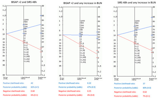 Likelihood ratios for SAP and death for single parameters and their combinations within the first 48 h are shown in Table 4, Table 5, and Table 6. The pretest probability of SAP and death in our sample was 10.7% and 5.7%, respectively. Upon admission, BISAP ≥ 2 and SIRS showed only a post-test probability of 23%, but after 48 h, SIRS and BUN ≥ 30 mg/dL showed the highest post-test probability of SAP (56% and 46%, respectively). Any rise in BUN and a rise in heart rate over 20 bpm during the first 48 h slightly increased the probability of SAP from 10.7% to 28% and 26%, respectively, whereas any rise in hematocrit only reached a post-test probability of SAP of 15%. When combining the parameters independently related to SAP (Figure 1), we found that BISAP ≥ 2 combined with persistent SIRS after 48 h and any rise in BUN combined with persistent SIRS showed the highest post-test probabilities (82% and 80%, respectively). Furthermore, those combinations rose the probability of death from 5.7% to 73% and 70%, respectively.