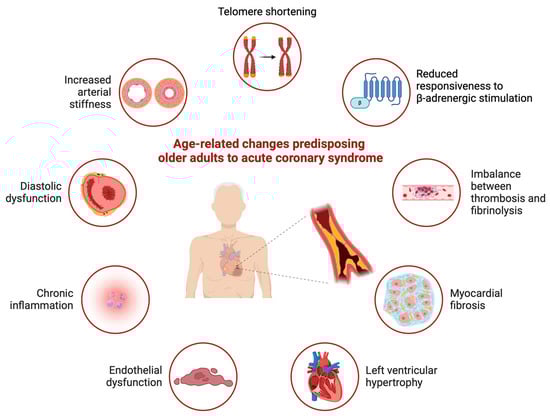 By 2050, approximately 16% of the global population will be ≥65 years of age, with a projected life expectancy of 77.2 years [1]. Although the term “older adult” has been used to refer to a range of age subgroups in the medical literature, the American College of Cardiology/American Heart Association’s Guideline for the Evaluation and Diagnosis of Chest Pain defines older adults as those ≥ 75 years of age [2]. Approximately 35–40% of all cases of acute coronary syndrome (ACS) occur in older adults, who have an 8-year mortality rate of 77% after myocardial infarction (MI) [3,4,5,6]. Older adults exhibit age-related changes that predispose them to ACS (Figure 1), including an increased prevalence of inflammaging [7]. This phenomenon, characterized by a chronic pro-inflammatory state, is a major contributor to the development and progression of atherosclerosis. Nonetheless, older adults remain substantially underrepresented in major clinical trials, thus leading to a paucity of evidence-based guidelines tailored to this population [8]. Consequently, the management of older patients with ACS is often guided by extrapolated trial findings from younger populations.