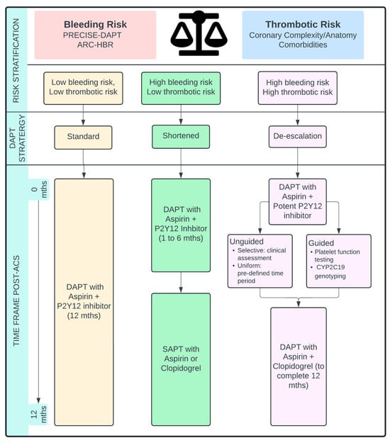 Low-dose aspirin in combination with a potent P2Y12 inhibitor (prasugrel or ticagrelor) for 12 months after ACS is the recommended standard dual antiplatelet therapy (DAPT) strategy, which is superior to clopidogrel in decreasing ischemic events, despite posing a higher bleeding risk [33,34]. However, DAPT therapy in older populations after ACS can be challenging, because multiple comorbidities as well as complex coronary disease are often present, thus increasing bleeding and/or thrombotic risk. The 2021 American College of Cardiology/American Heart Association Guideline for Coronary Artery Revascularization, suggests that more potent P2Y12 inhibitors should be used with caution in older adults receiving standard DAPT therapy due to increased bleeding risk [36]. Similarly, the recent 2023 European Society of Cardiology Guideline for the Management of Acute Coronary Syndromes, has newly recommended the consideration of clopidogrel as the P2Y12 inhibitor in older patients with ACS (≥ 70 years of age), particularly in those with a high bleeding risk (class 2B, level B recommendation) [35]. Consideration should therefore be given to bleeding risk versus thrombotic risk, as well as standard versus alternative DAPT strategies, to better individualize DAPT therapy in older patients (Figure 3).