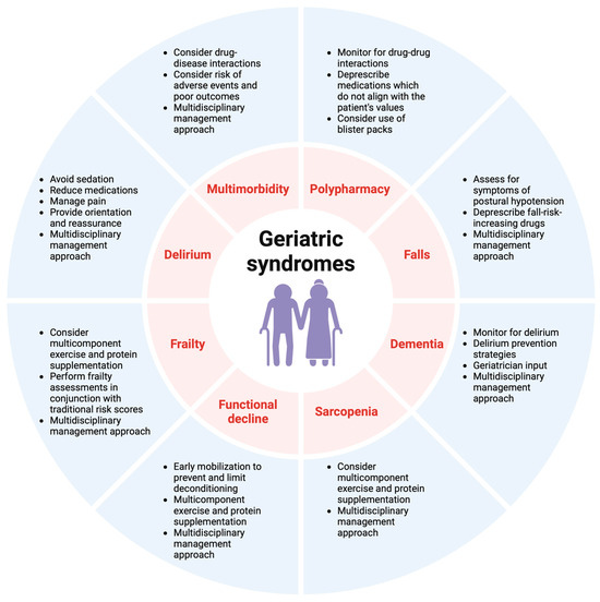 Delirium, which frequently occurs during the hospitalization of older people, increases mortality and poor outcomes [149]. Its incidence in patients ≥ 75 years of age admitted for acute cardiac diseases is 17.2%, thus leading to prolonged hospitalization, functional decline, and a four-fold higher 12-month mortality risk [150]. Delirium is preventable in 30–40% of cases through reorientation strategies, environmental modifications, the use of visual and hearing aids, and the avoidance of precipitating medications such as benzodiazepines [149]. In a study of 908 patients ≥ 70 years of age by Tonet et al., patients who were malnourished or at high risk of malnutrition had a 50% mortality rate over a 288-day follow-up period [151]. Medication non-adherence among older patients is also associated with an elevated risk of hospitalization and mortality, and a decreased quality of life [152].