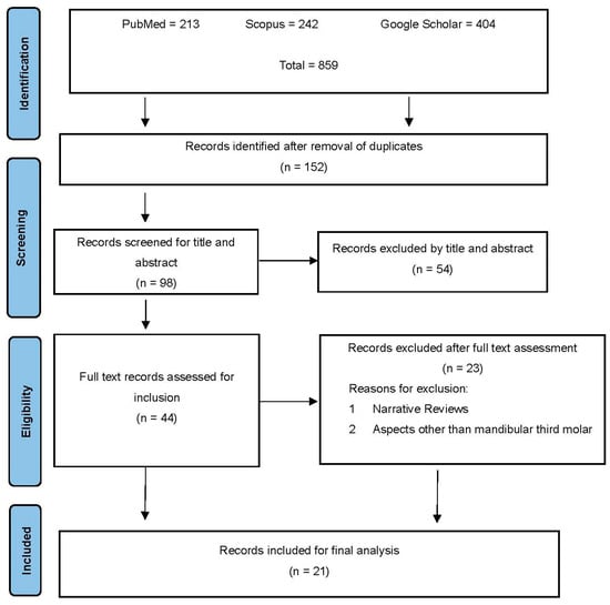 The inclusion criteria were as follows: studies reported in English and Spanish; those describing AI; those conducted to investigate the mandibular third molar; and original studies, including randomized clinical trials. Reviews, studies investigating other dental aspects, technical reports, and studies reported in other languages were excluded from this review. Language restriction was carried out as, during the search, we did not find studies that met the whole inclusion and exclusion criteria in other languages.