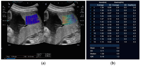 (a) The single 5 mm region of interest (ROI) placed in an area of good reliability as guided by the propagation map on the left; Homogeneous colour in the box on the left side of the image indicates uniform SWV, while on the right side, closely-spaced parallel lines indicate good reliability and low standard deviation. (b) Calculation of the mean, SD, median, and IQR from thirteen separate ROIs as recommended by the manufacturer.