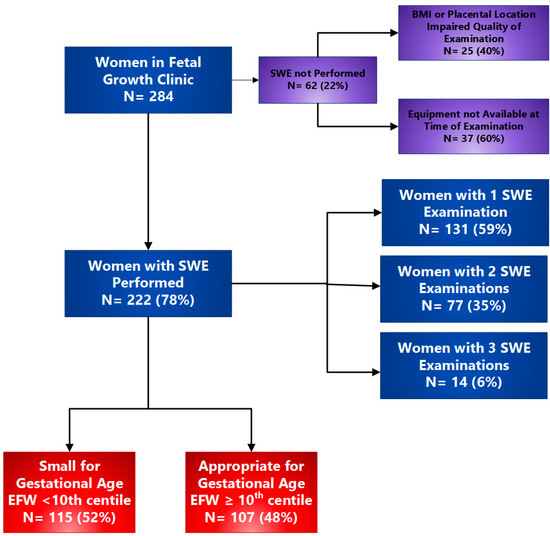 Over the study period, 284 women met the inclusion criteria and were recruited into the study. SWE was unable to be performed on 62 women because either maternal BMI or placental location and depth precluded adequate assessment of the placenta, leaving 222 women on whom SWE was successfully performed, thus constituting the final study cohort (Figure 2).