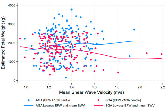 Scatterplot and locally estimated scatterplot smoothing (Lowess) curve investigating unadjusted relationship between estimated fetal weight and shear wave velocity in appropriate-for-gestational-age (AGA) and small-for-gestational-age (SGA) pregnancies.