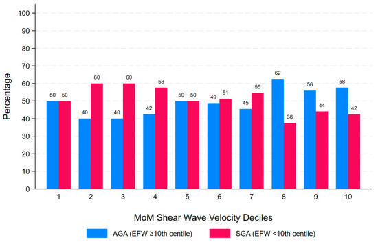 Multivariable logistic regression models developed to investigate the association between SWV and SGA, adjusting for BMI, showed that SWV MoM was not associated with EFW < 10th centile in any model, regardless of whether SWV MoM was examined as quartiles, deciles, or binary variables of the highest quartile and deciles (Table 2). Figure 4 presents the deciles of SWV MoM and the percentage of each decile for EFW < 10th centile and controls.