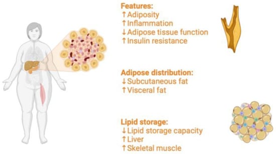 Obesity is a global health disease involving adults and children, primarily in occidental countries [1]. Body Mass Index (BMI) represents the value by which obesity is classified. Thus, a BMI greater than 30 kg/ indicates a state of obesity. Moreover, obesity can be subclassified into four types: I (BMI between 30 and 34.9 kg/), II (BMI between 35 and 39.9 kg/), III (BMI ≥ 40 kg/), and IV (BMI ≥ 50 kg/). Obesity derives from a chronic imbalance between caloric intake and energy consumption. The most critical capacity of adipose tissue (AT) is that the adipocytes can accumulate large amounts of lipids within droplets. This leads patients with obesity to a chronic inflammatory state, causing metabolic dysfunctions and insulin resistance (IR) (Figure 1) [2]. The chronic inflammation results from high levels of adiposity. It is associated with the development of several inflammatory conditions mediated through the profound effects of adipokines on a broad range of immune cells, including dendritic cells, innate lymphoid cells, and neutrophils [3]. Albeit the molecular mechanism is still unclear, there is consensus regarding the activation of adipose tissue macrophages (ATMs), which contribute to sustaining a chronic inflammatory condition in obesity [4,5]. A specific spectrum of macrophages populates obese AT, resembling neither the M1 nor M2 type, rather a particular population characterized by metabolically activated (MMe) or oxidized (Mox) forms. These kinds of MMe and Mox macrophages are produced in response to metabolic cues like free fatty acids, high insulin, high glucose, oxidized phospholipids, and oxidized LDL. Furthermore, they express different cell-surface proteins, including ABCA 1, CD36, and PLIN2 for MMe; heme- oxygenase-1 (HO-1), sulforedoxin-1 (Srnx-1), thioredoxin-1 reductase (Txnrd-1) for Mox [6]. In obese AT, ATMs MMe and Mox species produce proinflammatory cytokines like IL-6, Il-1β, Tumor Necrosis Factor-α (TNF-α) [7], promote T-cell activation, lysosomal activity, and lipid debris scavenging.