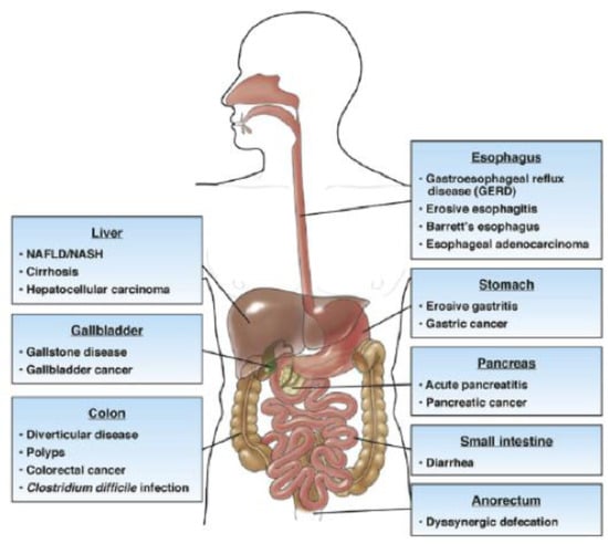 Adipose tissue is also a reservoir of mast cells whose number increases in patients with obesity. Their degranulation generates the secretion of strong proinflammatory and regulatory mediators, as well as tryptase and chymase, cytokines/chemokines. Furthermore, mast cells are strictly associated with a proinflammatory status in adipose tissue by their indirect impact on immune cell attraction and activation. They promote adipose tissue remodeling and fibrosis by adipocyte differentiation, fibroblast proliferation, and enhancing extracellular matrix protein expression [8]. Adipose tissue angiogenesis controls adipocyte metabolism and establishes communication between adipose tissue and the rest of the body. It is required also for progenitor cell proliferation and tissue remodeling. Applying single-cell and single-nuclei sequencing has opened our horizons to the role of specific signaling pathways operating between endothelial cells, adipocytes, and progenitor cells and their derangements in obesity [9]. In this way, there is an alteration of gastric motility and a consequential impact on its mucosa. Obesity has become a challenge for different medical professionals, from gastroenterologists to surgeons. Hence, it is important to underline how obesity can involve several pathological processes, representing a risk factor for developing type II diabetes, hypertension, stroke, cardiovascular disease, dyslipidemia, osteoarthritis, and asthma. The surgical procedures for obesity have grown since the mid-twentieth century, reducing BMI and comorbidities, particularly type II diabetes and hypertension [10]. Obesity also modifies the gastrointestinal tract (Figure 2) and is a risk factor for gastric cancer and cardiac tumors [11]. However, no substantial evidence exhibits the cellular modifications in the gastric mucosa of patients with obesity. Throughout this study, we have found specific inflammatory cell populations in the gastric mucosa of selected patients with obesity.