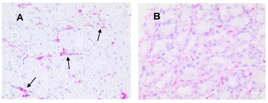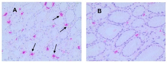 (A) Gastric tissue in obesity and red-stained mast cells positive to the anti-tryptase antibody. Arrows indicate single mast cells near microvessels (×20 magnification). (B) Case–control in normal tissue.