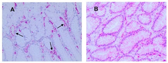 (A) Gastric tissue in obesity and red-stained microvessels positive to anti-CD31 antibody. Arrows indicate single microvessels with a visible lumen (×20 magnification). (B) Case–control in normal tissue.