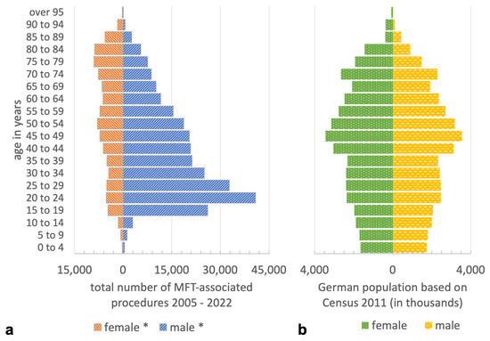 (a) Age–gender diagram of the total number of MFT-associated procedures 2005–2022. (b) Age–gender diagram of the German population based on census 2011.