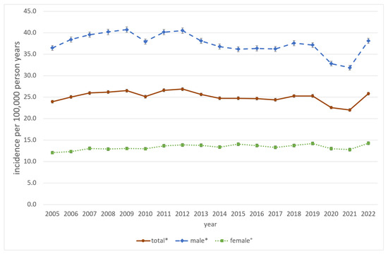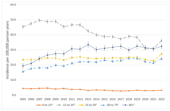 Older adults from 60 to 79 years showed an incidence rate of 21.2 (21.0–21.4), varying from 15.6 [15.0–16.2] in 2005 to 24.5 [23.7–25.2] in 2018. In 2022, the incidence was 24.2 [23.5–24.9], an increase of 55.1% within the observational period. Among elderly people (80 years and older). The total incidence rate was 29.1 [28.7–29.5], ranging from 19.4 [18.0–20.8] in 2005 to 32.5 [31.0–34.0] in 2019. With an incidence of 32.3 [30.9–33.8] in 2022, this represents the strongest increase with 66.7% during the observational period.