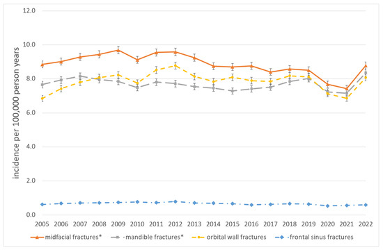 Historically, in the era of early industrialization, the incidence of maxillofacial fractures increased due to occupational accidents, leading to improvements in occupational safety. With the development of individual mobility, maxillofacial fractures caused by traffic accidents increased significantly until the introduction of airbags and mandatory seat belts in cars. Conversely, sports and leisure accidents, as well as fractures caused by physical violence, have increased in recent decades [13,14]. There is only scarce data on the incidence and time trends of maxillofacial fractures in Germany in recent years. Data from a regional single-center study suggest a slight overall increase in midfacial fractures, with a strong increase among elderly people and a slight decrease in midfacial fractures among younger people [6]. Nevertheless, there is a paucity of population-based data concerning trends in the incidence of maxillofacial fractures. Studies from other industrialized countries remain indistinctive. Some studies suggest an increasing incidence of MFT-associated fractures [15,16,17]. Others show a decrease in the number of facial fractures [18,19,20]. To the best of our knowledge, there is no nationwide investigation representing a Central European country like Germany. The objective of this study was, therefore, to estimate the national and regional age- and gender-standardized incidence of MFT-associated procedures in Germany between 2005 and 2022 and evaluate age- and gender-adjusted time trends.
