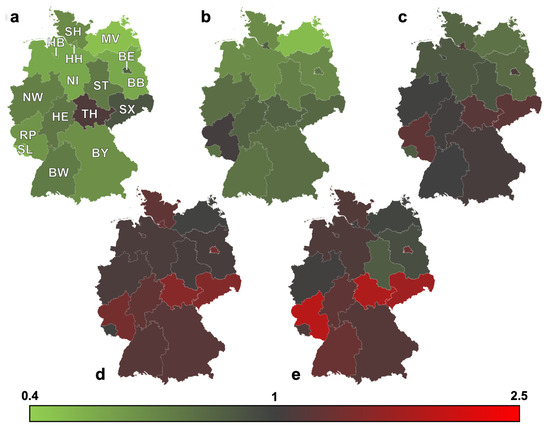 Relative risk for MFT-associated procedures Germany 2014–2022 vs. 2005–2013 stratified by age-group and federal state. (a) Age group 0–14 years. (b) Age group 15–34 years. (c) Age group 35–59 years. (d) Age group 60–79 years. (e) Age group over 80 years. * p-value < f 0.05; SH—Schleswig Holstein; MV—Mecklenburg-Vorpommern; HH—Hamburg; HB—Bremen; NI—Lower saxony; BE—Berlin; BB—Brandenburg; ST—Saxony-Anhalt; NW—North Rhine-Westphalia; HE—Hesse; TH—Thuringia; SX—Saxony; RP—Rhineland-Palatinate; SL—Saarland; BW—Baden-Wurttemberg; BY—Bavaria.