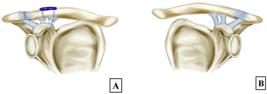 - Choi, N.H.; Lim, S.M.; Lee, S.Y.; Lim, T.K. Loss of Reduction and Complications of Coracoclavicular Ligament Reconstruction with Autogenous Tendon Graft in Acute Acromioclavicular Dislocations. J. Shoulder Elb. Surg. 2017, 26, 692–698. [Google Scholar] [CrossRef]