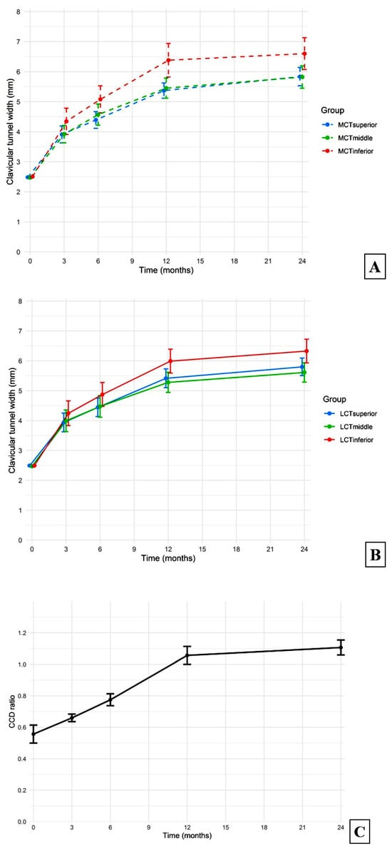 Radiographic follow-ups of mean and standard deviations of the (A) medial and (B) lateral clavicular tunnel widths and (C) coracoclavicular distance (CCD) ratios at different time points.