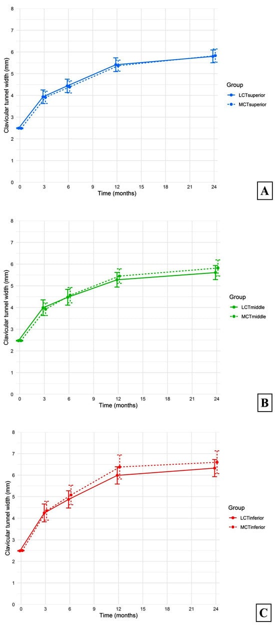 At all regular follow-up periods, significant increases in the average widths of the medial and lateral clavicular tunnels were found compared with the immediate postoperative measurements (all p-values < 0.05) (Figure 4A,B). There were no significant differences in mean superior, middle, or inferior levels of clavicular tunnel widths between the medial and lateral clavicular tunnels at all time points (Figure 5A–C). The p-values of the comparisons between the medial and lateral clavicular tunnels at the 3-month, 6-month, 12-month, and 24-month follow-ups at the superior level were 0.92, 0.83, 0.85, and 0.82, respectively, at the middle level 0.75, 0.68, 0.44, and 0.36, respectively, and at the inferior level 0.75, 0.50, 0.24, and 0.40, respectively.