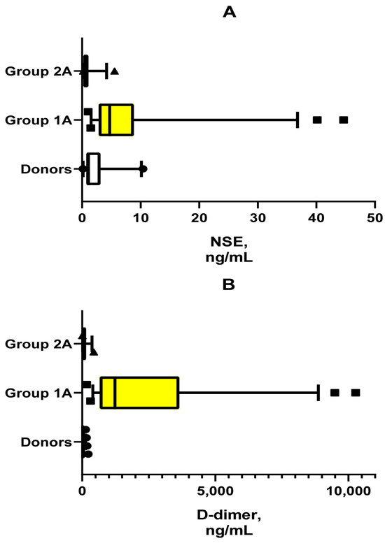 Ratio of plasma concentrations of NSE (A) and D-dimers (B). Note. The graphs show data from 5th to 95th percentiles. The shapes indicate outliers. The median of the data groups is also shown. The reliability of statistically significant differences in data is presented in Table 5.