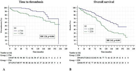 (A) Time to thrombosis and (B) overall survival stratified according to the systemic inflammatory index (SII). The Kaplan–Meier method and log-rank tests were used.