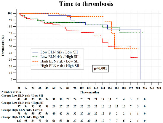 When patients were stratified according to both ELN risk score and the SII (cut-off 1764), only ELN high-risk patients with high SIs had an inferior TTT when compared to other patient subgroups, which had comparable thrombotic risks over time (p < 0.001), as shown in Figure 2.