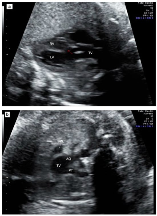- Gómez, O.; Soveral, I.; Bennasar, M.; Crispi, F.; Masoller, N.; Marimon, E.; Bartrons, J.; Gratacós, E.; Martinez, J.M. Accuracy of Fetal Echocardiography in the Differential Diagnosis between Truncus Arteriosus and Pulmonary Atresia with Ventricular Septal Defect. Fetal Diagn. Ther. 2016, 39, 90–99. [Google Scholar] [CrossRef]