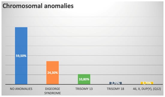 In total, 37 of 47 (78.7%) patients underwent karyotyping, and 15/37 (40.5%) had abnormal results. Nine of thirty-seven (24.3%) patients had 22q11.2 microdeletion, which constituted the most prevalent genetic anomaly within the cohort (9/15 = 60.0%). A summary of chromosomal anomalies is provided in Figure 3.