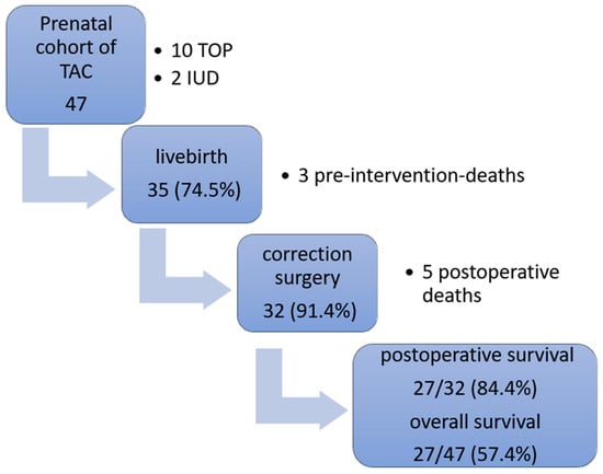 The statistical data analysis was conducted using Excel (Microsoft Office 2021). Continuous variables are presented as either the mean ± SD or the median (range), depending on the distribution of the data. Categorical data are expressed as frequencies (n) and percentages (%). In order to evaluate the predictive capacity for outcomes, the following parameters were compared between the group of survivors and the group of non-survivors (defined as intrauterine death or postnatal death) during the follow-up period: TAC subtype, the presence of additional anomalies (e.g., chromosomal, extracardiac or intracardiac anomalies; fetal growth restriction (FGR)) and echocardiographic parameters (e.g., the number of valve leaflets; truncal valve stenosis or insufficiency). A chi-square test was employed for the purpose of comparing the two outcome groups.