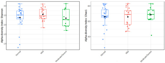 Alpha diversity analysis using Shannon and Chao1 diversity indexes. The colours denote study group: Normal (blue), Mild (red), and Moderate/severe (green).