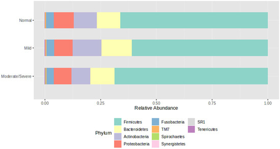 Relative abundance (%) of microbiota phyla between study groups is shown in Figure 2. Firmicutes was the most abundant phylum in all groups (Normal 66.1%, Mild 61.0%, Moderate/severe 68.8%), followed by Bacteroidetes (Normal 10.6%, Mild 13.5%, Moderate/severe 10.9%), Actinobacteria (Normal 10.5%, Mild 13.2%, Moderate/severe 8.5%) and Proteobacteria (Normal 8.8%, Mild 8.1%, Moderate/severe 7.8%).