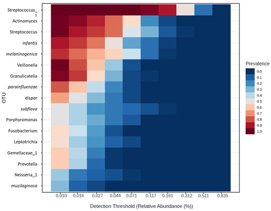 The core microbiome analysis identified the set of taxa that are detected in a high fraction of the population above a given abundance threshold (Figure 3). Ranking of core OTUs within all samples by relative abundance (%) showed that the genera Streptococcus and Actinomyces and species B. infantis and P. melaninogenica were the dominant components of the oral microbiota.