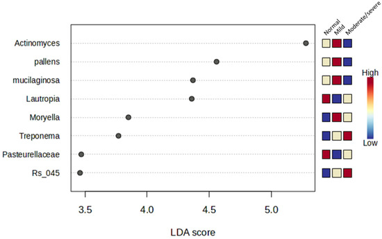 Bacterial taxa diversities between DeMeester groups (Normal, Mild reflux, and Moderate/severe reflux). Bacterial taxa were detected by LEfSe (p < 0.05, linear discriminant analysis (LDA) > 2 logs). The dots denote the log Linear Discriminant Analysis (LDA) score. Taxas above log LDA score cut off > 2.0.