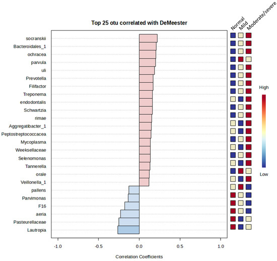 The taxa that were positively correlated with DeMeester score severity were socranskii, Bacteroidales_1, ochracea, parvula, uli, Prevotalla, Filifactor, Treponema, endodontalis, Schwartia, rimae, Aggregatibacter_1, Peptrostreptococcacea, Mycoplasma, Weeksellaceae, Selenomonas, Tannerella, orale, and Veillonella_1. Taxa that showed a negative correlation with DeMeester score severity were pallens, Parvimonas, F16, aeria, Pasteurellaceae, and Lautropia.