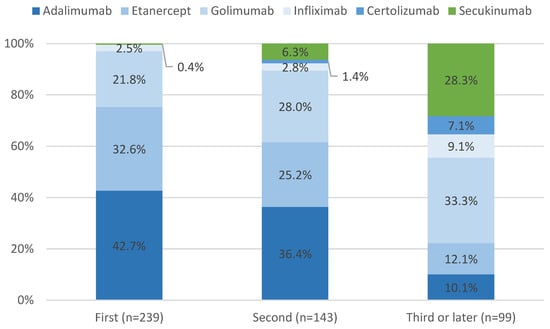 Among the 239 patients using their first line of therapy, the most common drug used was ADA (42.7%), followed by ETN (32.6%) and GOL (21.8%). The remaining 2.9% were treated with IFX (n = 6) and SEC (n = 1). Among the 143 patients on their second line of therapy (including biologic-naive patients who switched during follow-up), ADA (36.4%), ETN (25.2%), and GOL (28.0%) remained the most prevalent drugs. Figure 1 depicts the disposition of patients according to their treatment episode. The proportion of patients utilizing CTZ and IFX increased to 10.5%. Among the patients utilizing a third line of therapy (n = 99), we noticed a decrease in the proportion of patients prescribed ADA, ETN, and GOL (10.1%, 12.1%, and 33.3%, respectively), while the proportion of patients prescribed with SEC increased to 28.3%, along with an increment in the proportion of patients using IFX (9.1%) and CTZ (7.1%).